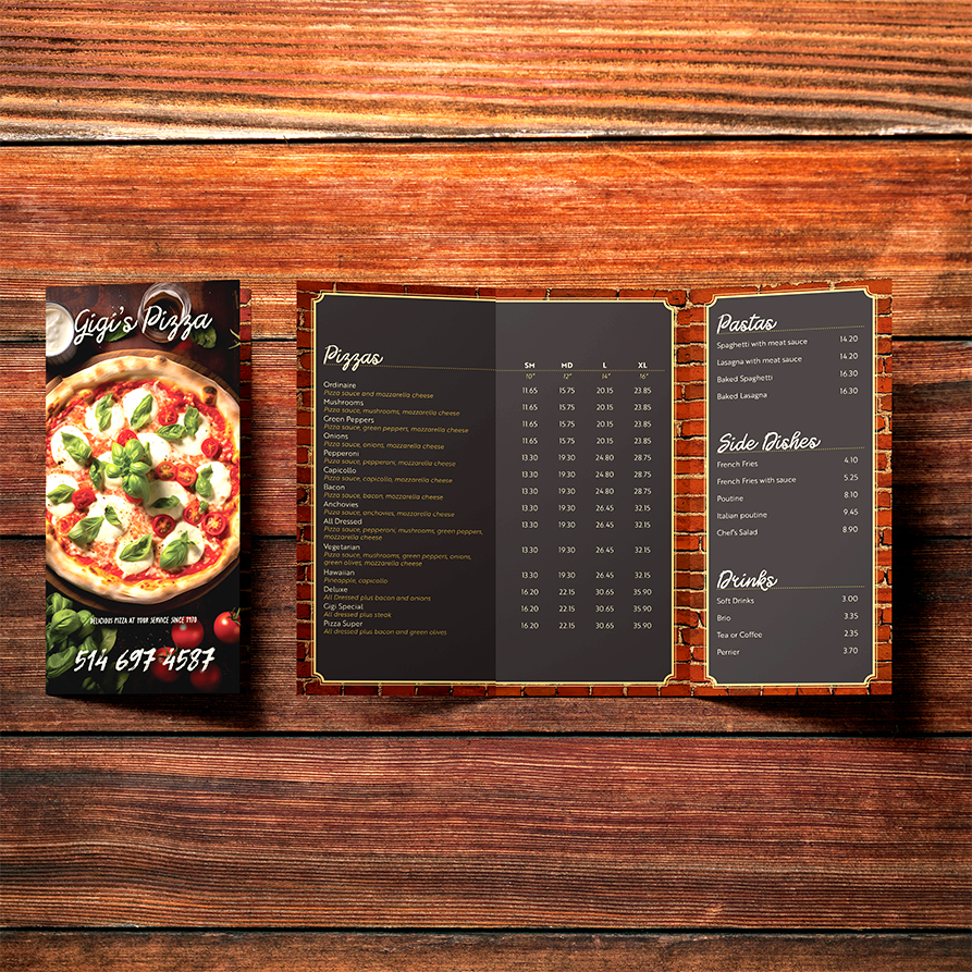This trifold serves as a menu for Gigi’s Pizza in an easy-to-read format.